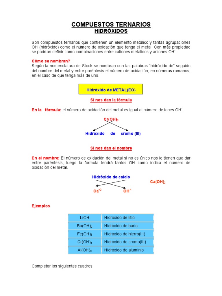 • nomenclatura tradicional • nomenclatura de stock • nomenclatura sistemática. Reglas generales de la nomenclatura de stock. Nombra o formula los siguientes hidróxidos. Cloruro de hierro (iii), hidruro de estaño (ii), óxido de cobre (i), hidróxido de mercurio (ii), ácido dioxoclórico (iii), tetraoxosulfato (vi) de hidrógeno. Consiste en indicar el numero de oxidacion, con números romanos y entre paréntesis, al final del nombre del elemento.